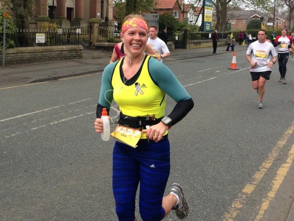 And then we were off. I set off at a blistering pace out of Old Trafford at 7:40/7:45 which worried me that I might have set off too quickly, but I thought stick with it, you’ve got to give it your all. I passed the 3:30 pacers and settled into my pace which was feeling surprisingly comfortable. Keen to reach mile 8 in Sale, where hubby & a friend would be, I kept the pace up and was soaking up the great atmosphere from all the supporters. Hubby was super pleased to see me so soon and ran alongside me for some quick words of encouragement and an offer of half a flapjack which I declined.