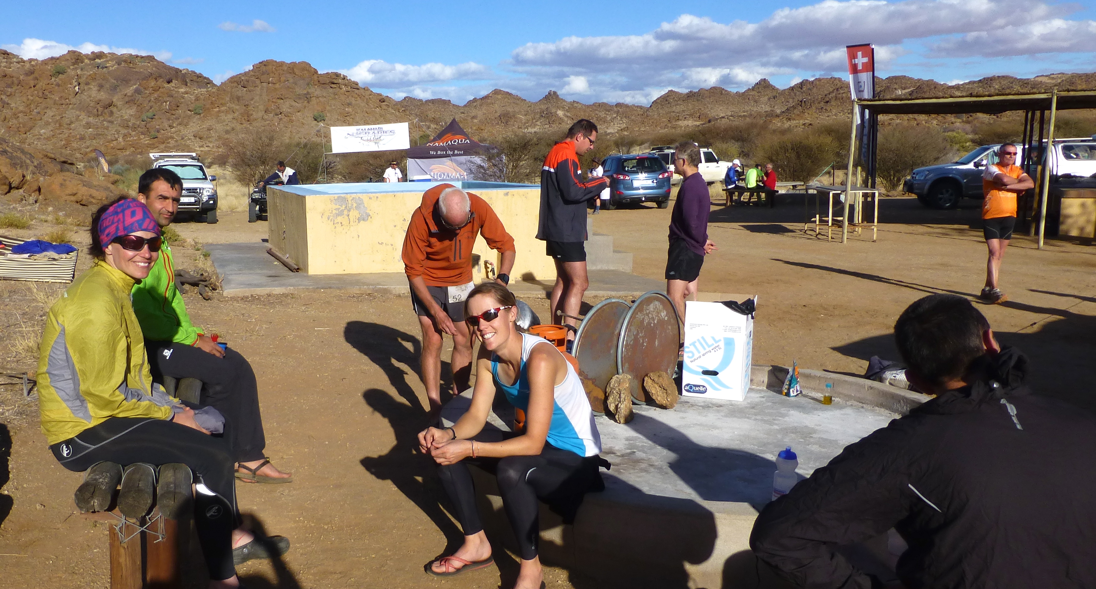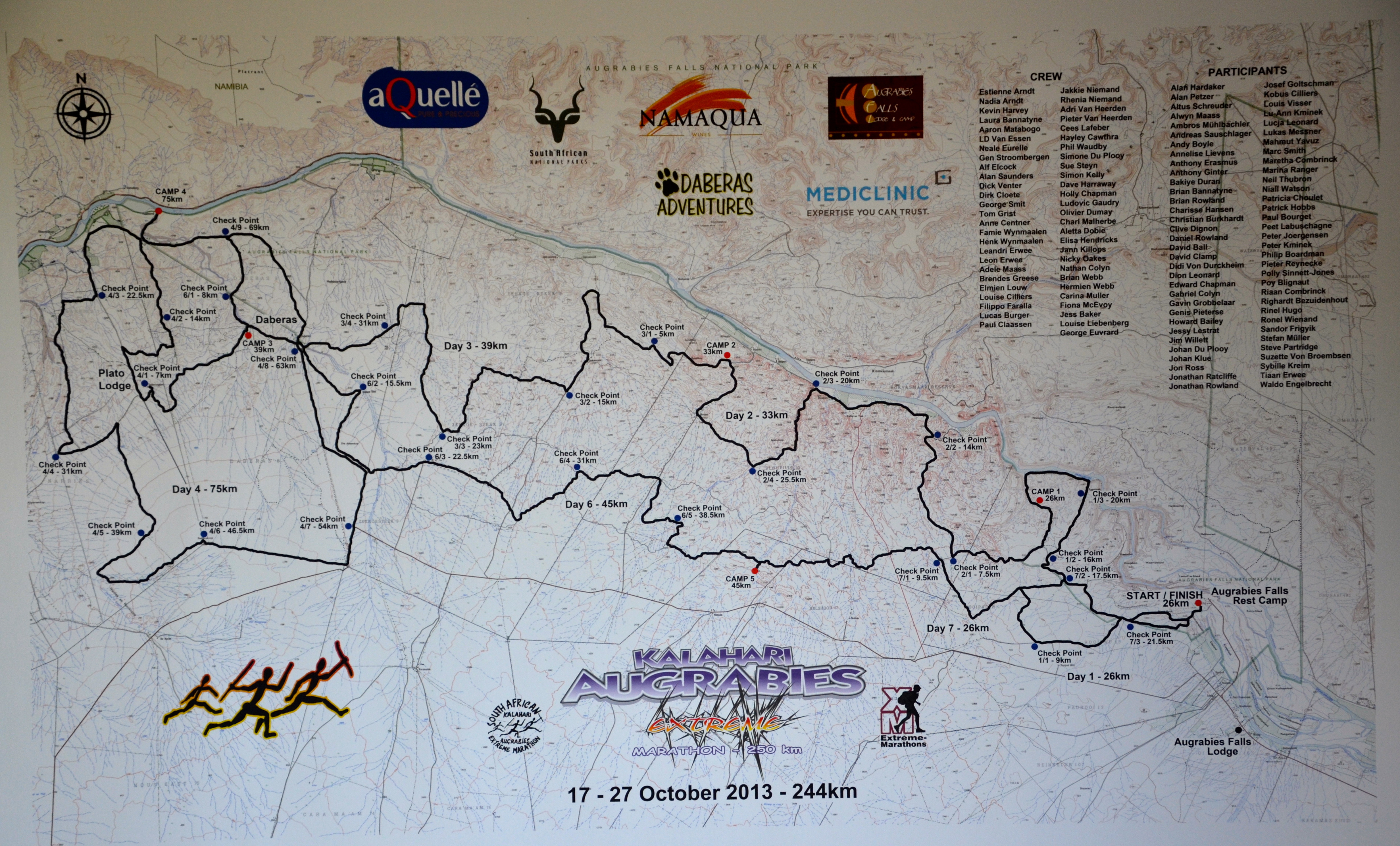 It all starts with our arrival at the hotel pre-race in Jo’Burg, I’m looking around wondering who else is taking part;some are obvious; wearing old race shirts, others not at all like Dion & I, dressed like we are off on holiday knocking back a few beers; and then the ‘Austrian Army’ dressed in their team colours with ‘KAEM‘ emblazoned across their kit, very obvious. We all start to congregate the following morning ready for the flight to Upington & start to make our introductions. Flying into Upington the starkness of the surrounds starts to dawn on all of us crammed into a tiny little plane, pretty much full of runners, as we look out the windows down below. It’s not long before we’ve landed & bussed the remainder of the distance to the Kalahari Augrabies Falls Lodge, a last taste of luxury & our pre-race base. On arrival we meet Nadia & Estienne Arndt, the masterminds behind this awesome challenge & are presented with our goodie bags, map & keys to our respective lodges. For the runners not travelling with a friend, the opportunity to meet their new room mate. Lucky for me I was running this with hubby, so know my roomie very well indeed.