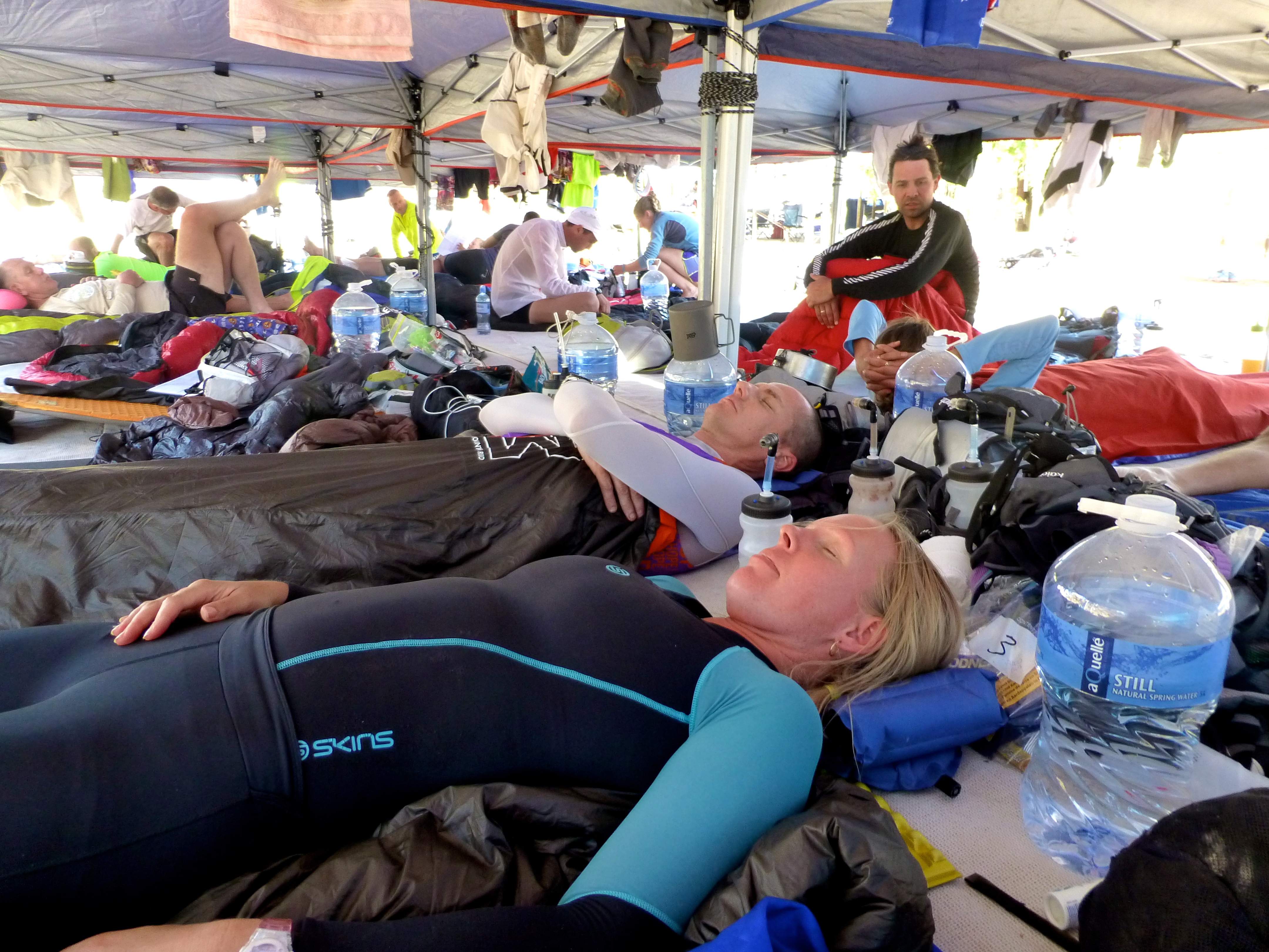 Thinking we are finally at the finish, the path takes a sharp turn left to finish the last 2kms through some thick, heavy sand, perfect to really zap the legs. Neil Thubron has caught up with me by here so we walk the last bit together, chatting away, putting in a final ‘run’ to the line. What a day, I’m over the moon to find out I am 2nd lady and in the low teens overall, with Dion in the top ten! What a start. Dion has my spot beside him reserved so I go about doing some stretching, rehydrating & refuelling and setting up my bed for the night. The first night routine sticks the entire week, with Dion getting in first & the rest of our gang arriving & placing ourselves around him, I make sure I stretch thoroughly, get changed into my camp casuals, drink, eat, drink, eat & make sure I book in for a massage (a half hour with Jess everyday was a Godsend) and making sure I spend plenty of time relaxing. It was great to receive the message so support that friends & family had emailed in each day, that was a real boost. Of course there is plenty of chit chat around the camp & it was truly spectacular to get to meet 62 fantastic competitors. We had a blind runner, Patricia, taking part, lead strongly by Jess her guide, so we would all congregate at the finish to cheer them in, the first day in particular brought a tear to your eye, especially thinking about that horrible descent & the boulder stage which was tough enough when you could see where you were going. Each night you get given your starting time depending on your placing, so the next day saw me heading off at 8am with the latest group to start.