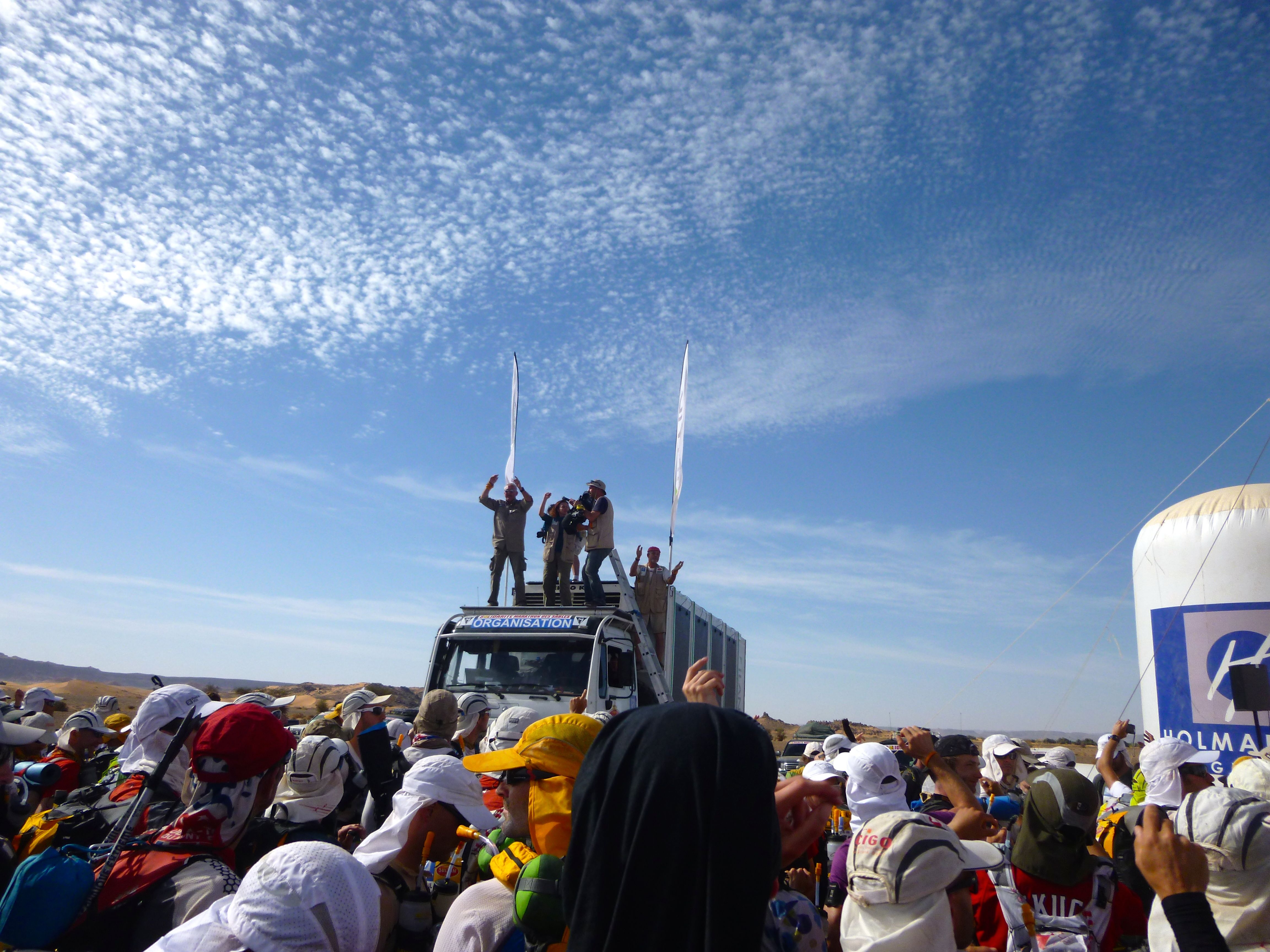 Race day starts pretty much the same every day, people start to wake at about 5am, by 6am everyone is awake & faffing around. Water collection is 6:30-7:30, then you are supposed to be at the start line for 7:45 for briefing and ready for a 9am start. Of course on day 1 most people are so eager we are all there with our bags on our backs standing up listening to Patrick waffle on while it gets hotter and hotter. By the last day we are turning up 5 minutes before. There’s no doubt Patrick loves the sound of his own voice but by the end of the week asking questions like – Have you got your hat? Yes! Have you got your sunscreen? Yes! Have you got your water? Really?! Obligatory happy birthdays are sung before AC/DC’s ‘Highway to Hell’ blares out, and we are off! The helicopter zooms overhead bringing up a sandstorm around the runners and people scatter out wide to make a break for it. It’s on!