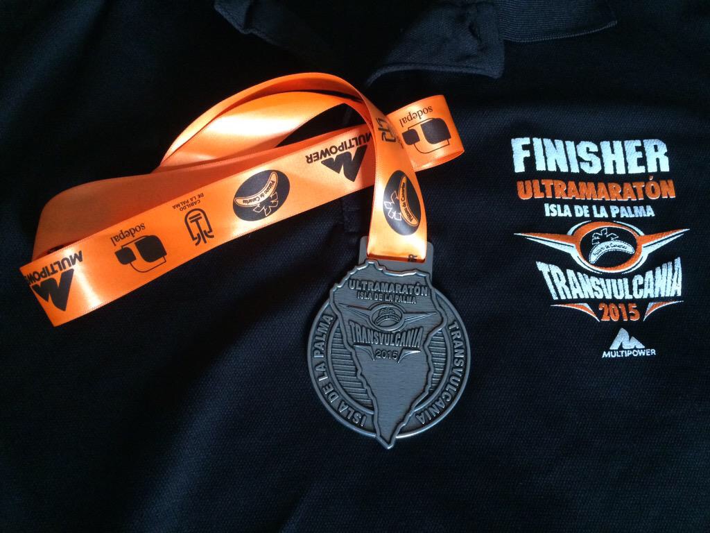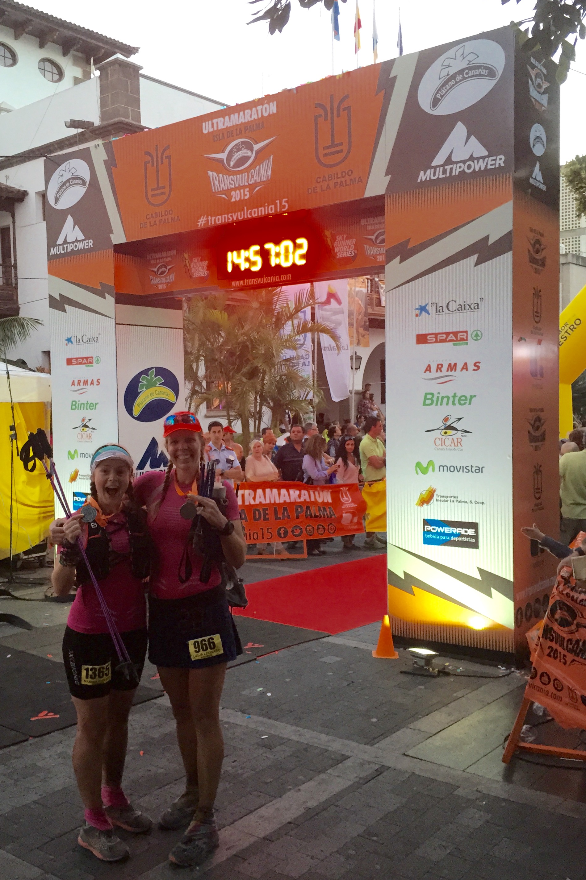 The last 5km section takes me 2hrs, aptly named the ‘sting in the tail’ starts with a few hundred metres in a sandy riverbed with about 500m of a nasty climb back up, here I see more people passing out, with Marina telling me later she sees the same guy I saw passed out then being airlifted out! When you finally reach the top, there is a flat road section to the finish which must be only about 1.5km but feels like forever, the street is lined with people and they are all cheering loudly and high fiving you so you can’t walk even though your legs want you too after that last climb. You see the big Transvulcania sign ahead but it’s not the finish that’s another 300m, turn right, turn left and there it is, the red carpet lined with throngs of supporters. I’ve done it, I’m a super legend! High five, high five! They’re all shouting and cheering me on, arms raised I cross in 14h 31min. What a day! I lean on my poles for a second before I spot a bench with a spare spot between 2 finishers, I sit and burst promptly into tears! Emotional the runner beside me gives me a congratulatory hug with tears in his own eyes. It’s not 2 minutes later and my running pal from TGC, Luis, finishes as well. I’m quickly on the phone to Dion I’m so excited I need to hear his voice but it’s so loud there I can hardly hear him, I hear his super proud of me and that Marina is only 20 odd minutes behind me, so I get back to the finish line to see her cross in 14h 54m! So proud of her as she has improved so much over the 7 months I’ve been working with her putting together a specific training plan first tailored to her Kalahari Race last year and then leading up to this incorporating specific training to get her mountain ready. I seem to be training her too well as she’ll be beating me next!