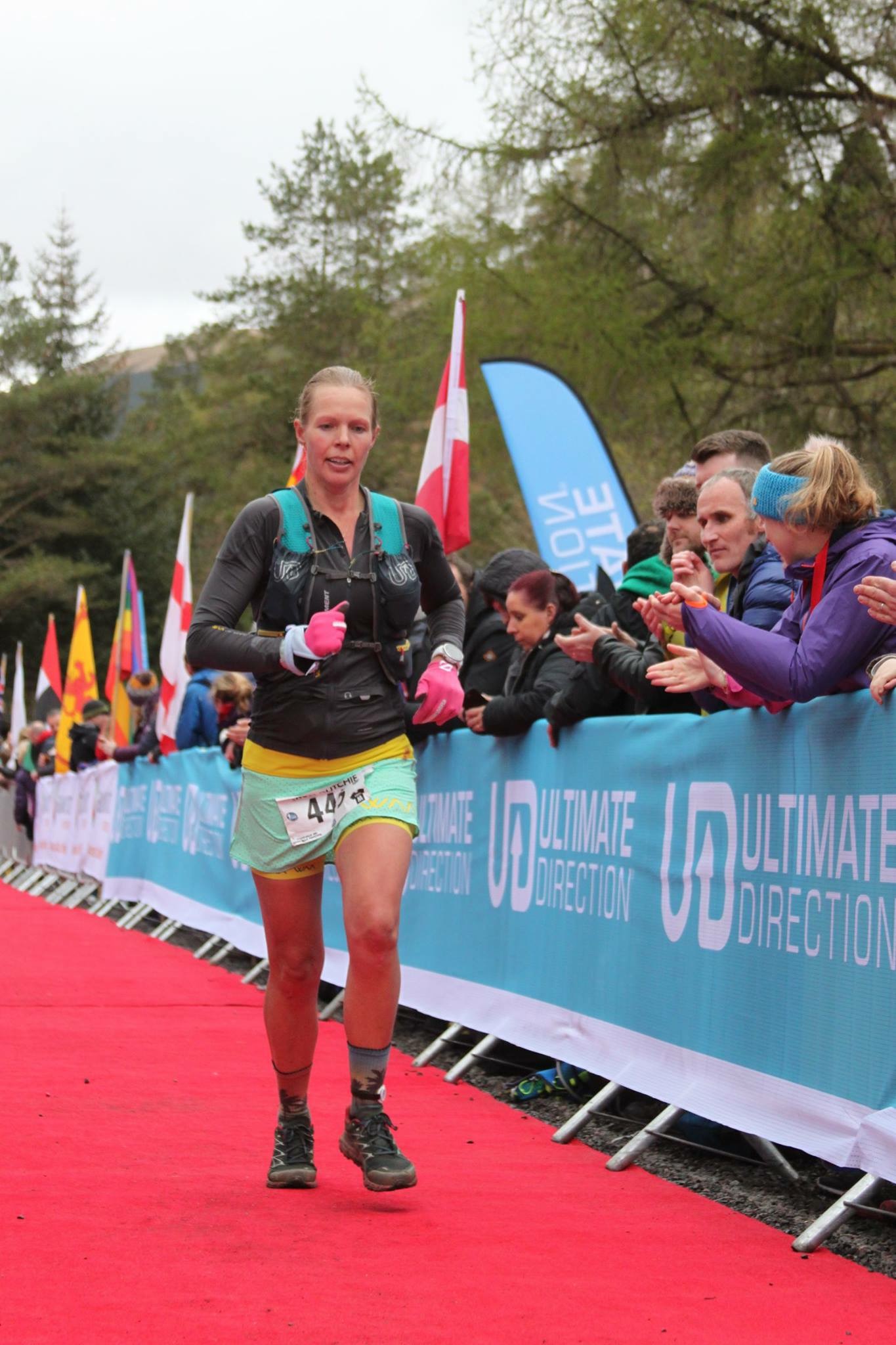 As I come towards Tyndrum the sound of bagpipes fill the air followed by the ringing of the cowbells; the finish line! It’s here! I’m still running and I’m smiling and I’m finishing in 11 hours! I hit the red carpet to the cheers of the crowd, including Dion, Gobi and Rhianon and the finishers medal is mine.