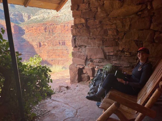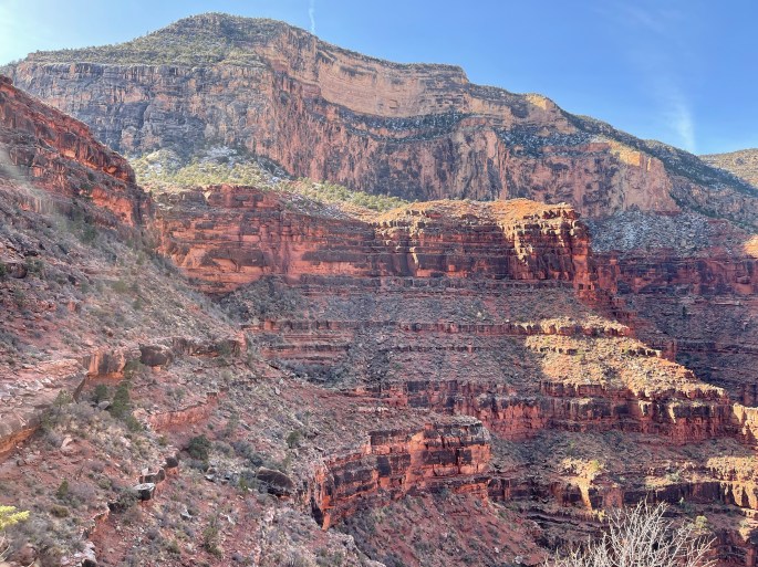The Hermit Trail is a steep descent into a dramatic side canyon which takes you down to the Colorado River with dizzying drop-offs and awe inspiring views. Snow patches were dotted along the top couple of hundred feet of the canyon which stood out starkly against the rich red rock. The first 2.5 miles of the trail drops 2,000 feet with some cobblestone pathways create by hand-placed smooth rocks which had a thin layer of ice so I was grateful for my trekking poles. At 2 miles we reach the Santa Maria Springs & Rest House built in 1913 which provides spring water and a shelter for some shade.