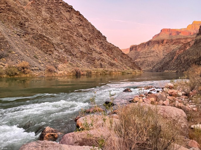 A deserted campsite awaited us down the bottom so we were spoilt for choice and picked a nice sheltered spot under a rocky overhang with a nice flat spot with enough room for all 4 of us. It doesn’t take long to set up camp and with time to spare we are keen to find the Colorado river which is reportedly a mile from camp, 2.4 miles later after numerous creek crossings and a bit of bushwhacking we make hear the roar of the rapids of the Colorado river and we make it there just in time for sunset. Fortunately we had all brought our head torches with us so the trip back was made following the beams of our lights. Before we ascended the final bank of Hermit creek back to camp we fill our water bottles from the stream. My heart skipped and my stomach dropped as I turned to make my way back up the bank and my light caught 2 eyes looking back at me from the bushes, at first I thought it must be something at the camp site, some reflective strip on a bag or something but somehow I could feel it was something else. I couldn’t tear my gaze away as the creature rose and I realized it was a huge elk with massive antlers. It was a surreal moment as he just snorted lightly and turned and walked away. I had to laugh to myself as of course my mind had immediately jumped to the thought it was a mountain lion!
