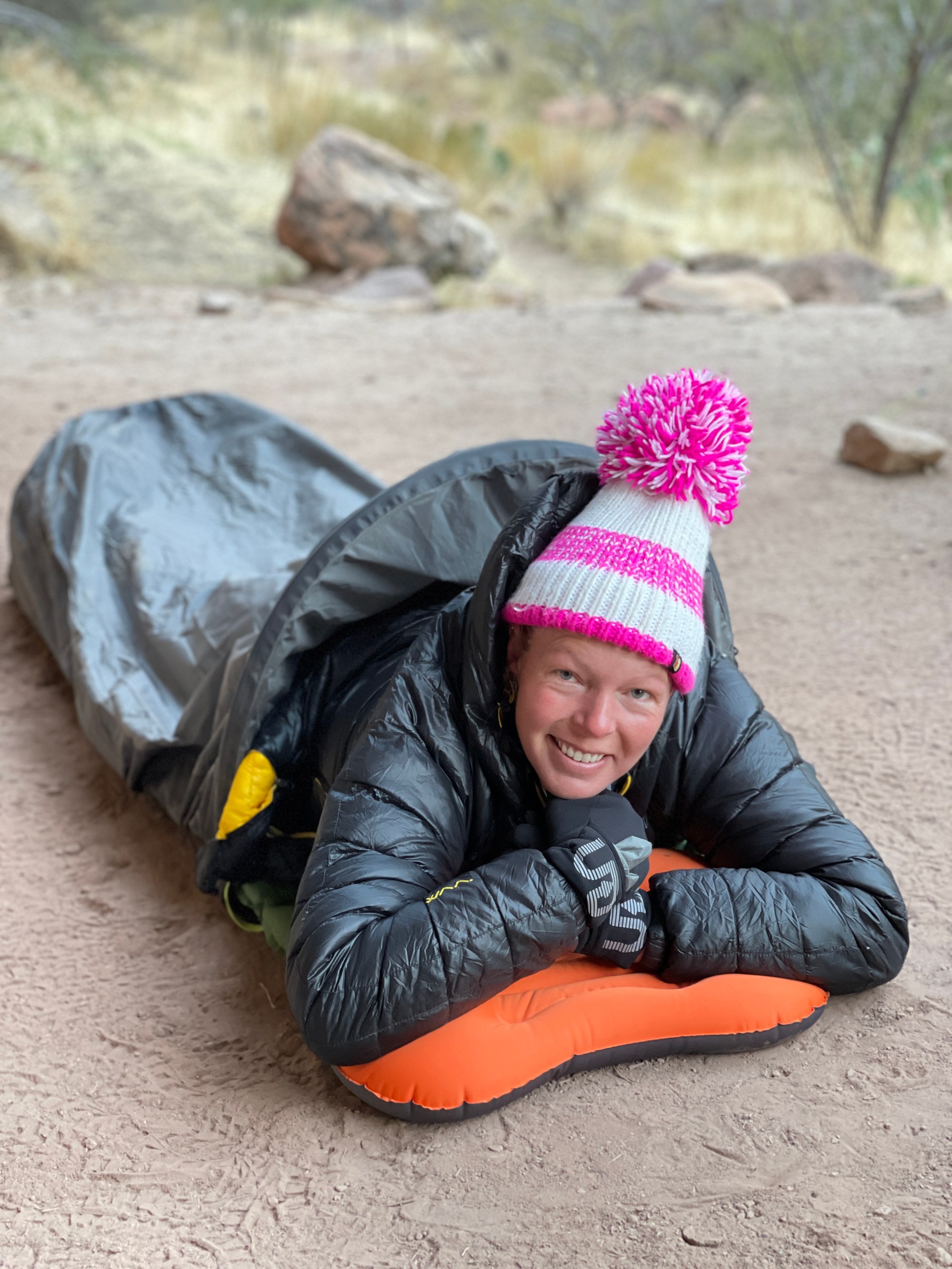 My breathing is panicked & shallow, it’s pitch dark and I feel trapped. I’m fumbling about near my head in the dark to switch on my head torch so I can see where the zip is to free me from the bivvy that feels like its suffocating me. Found it! Light, zip, night sky and cold air. Phew I’m released! I’ve never slept in a bivvy, actually my camping experience is limited to multi day race camps, and it’s taking me a bit to get used to. With the zip fully done up I’m totally sealed in and cutting the oxygen and I think I’m just breathing carbon dioxide but if I only zip up the mesh part to allow the freezing air in I am privy to the gorgeous night sky filled with stars and I can breathe but I can see what’s coming for me in the wilderness! My imagination is in overdrive; would a mountain lion just wander up to my bivvy to eat me, or would a rattlesnake come out in the cold night to pay me a visit? I channel my thoughts back to more positive ones of the day that brought me here, my first ever trek into the Grand Canyon.
